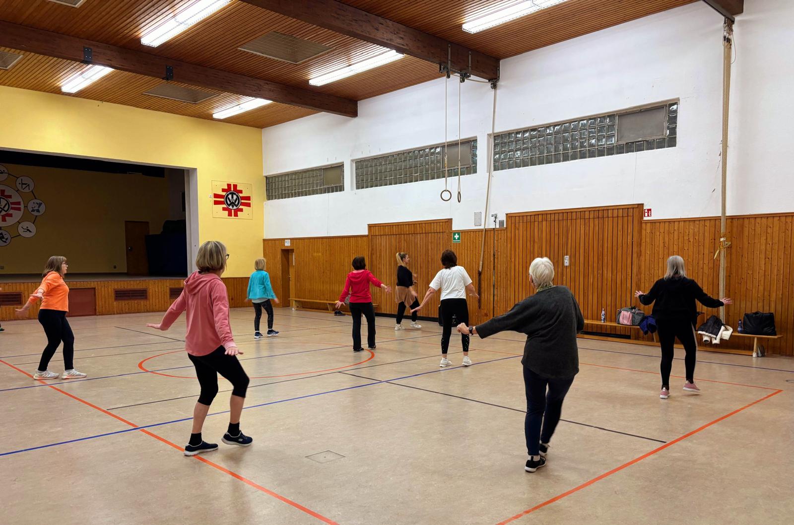 Die Trainingsstunde wird von den Trainerinnen Simone und Anjuschka geleitet, die die Teilnehmenden auf unterschiedliche Weise motivieren, sportlich aktiv zu sein. Die Stunde gliedert sich in drei Abschnitte: Zunächst erfolgt ein Aufwärmen mit Lockerungsübungen, die besonders für Schulter, Nacken und Hals geeignet sind. Im Anschluss steht der tänzerische Teil im Fokus, bei dem abwechslungsreiche Schrittfolgen und Choreografien zu verschiedenster Musik ausgeführt werden, um Ausdauer und Koordination zu fördern. Den Abschluss bildet die Bodengymnastik, bei der Übungen für Bauch, Beine und Po durchgeführt werden, gefolgt von Entspannungsübungen, um die Stunde ruhig ausklingen zu lassen. Für die Teilnahme sind bequeme Sportkleidung, Sportschuhe, ein Handtuch und etwas zu trinken erforderlich. Interessierte sind herzlich eingeladen, an den Kursen teilzunehmen.